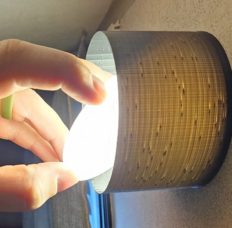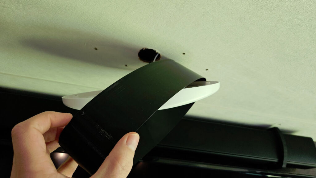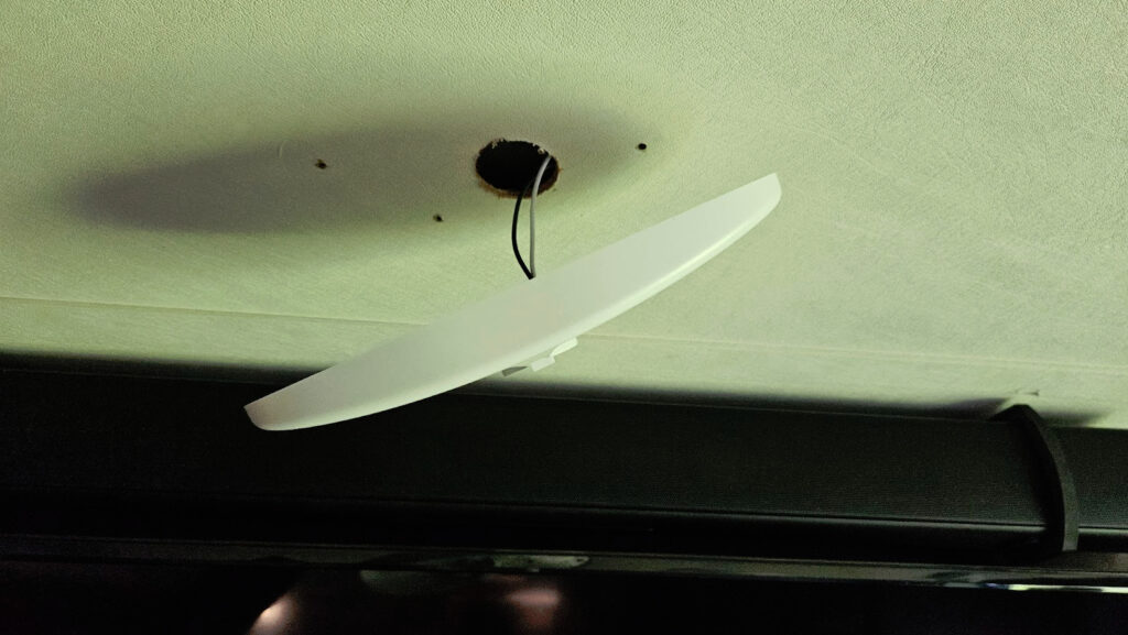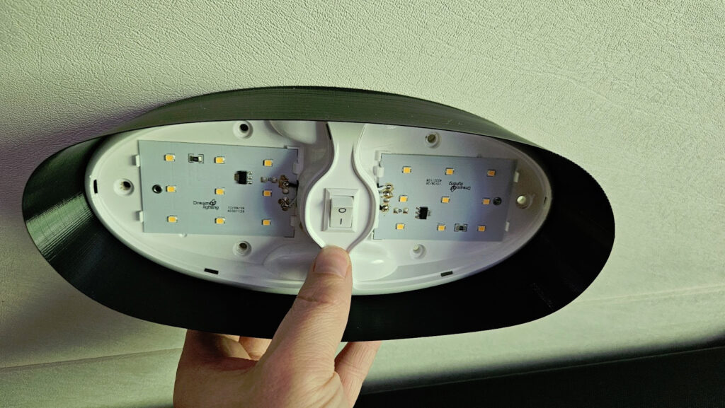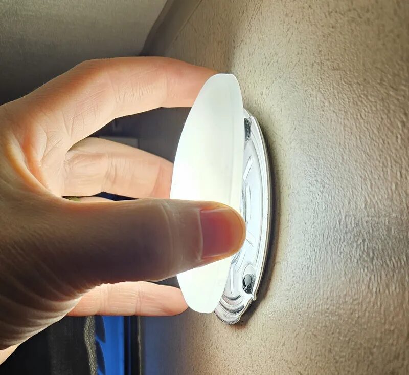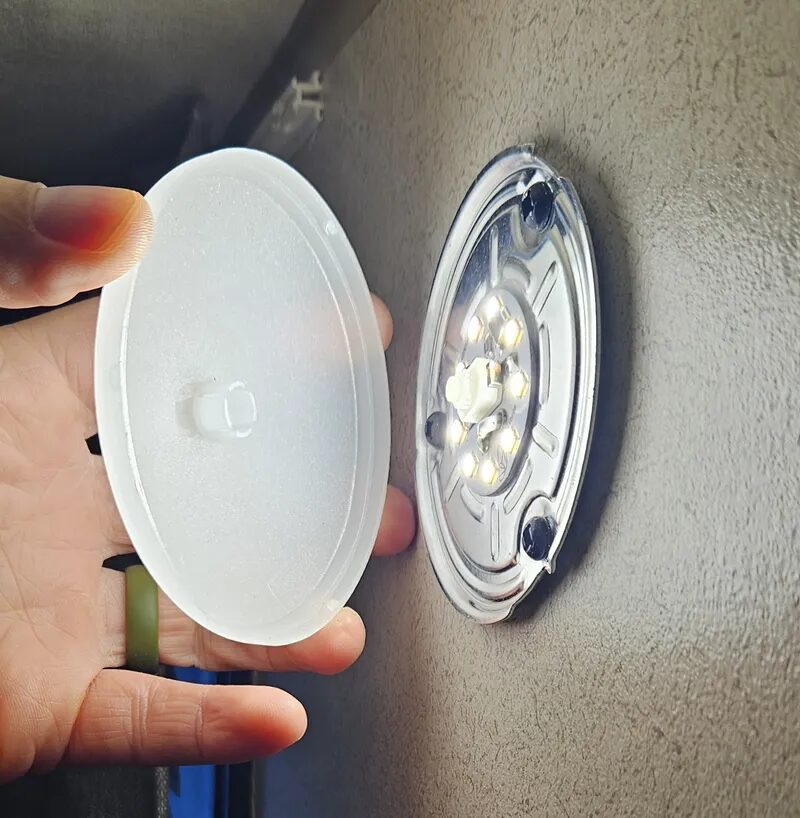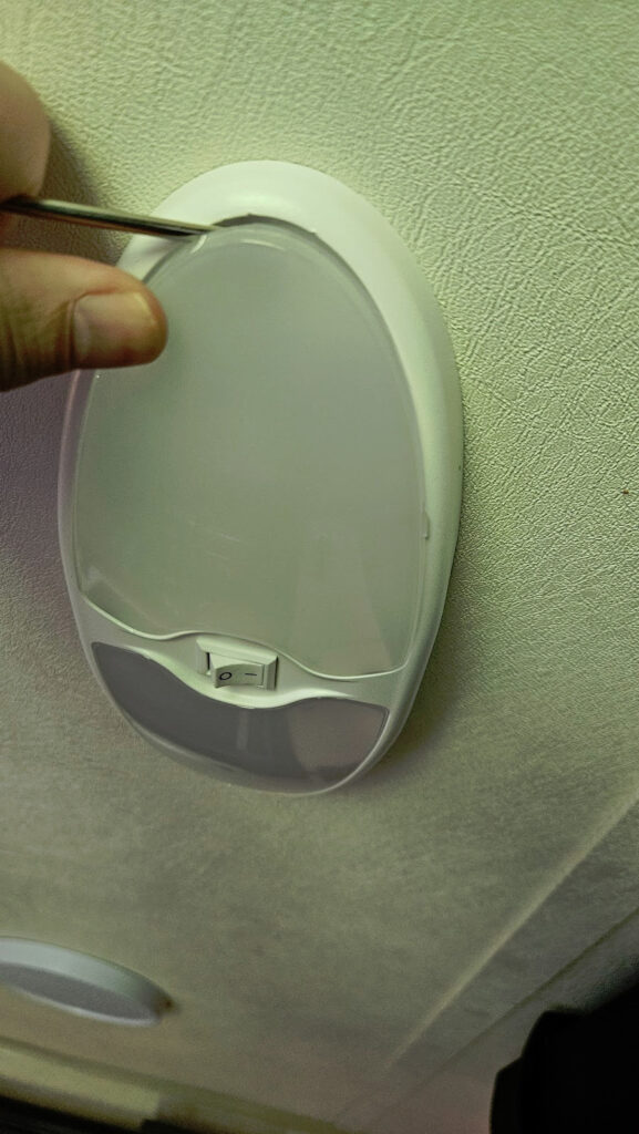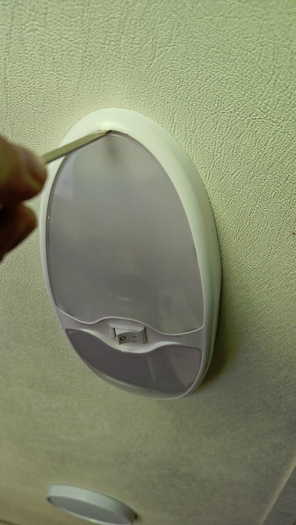 1. Pop off the diffuser cover of your interior RV light fixture, revealing the screws underneath.