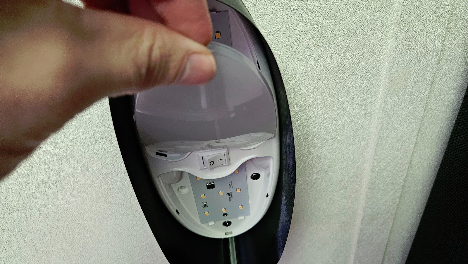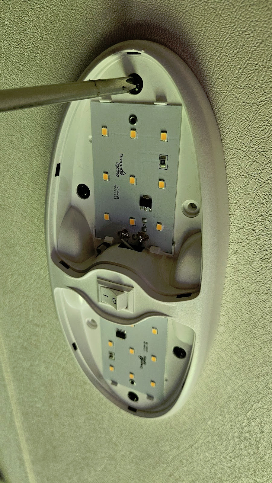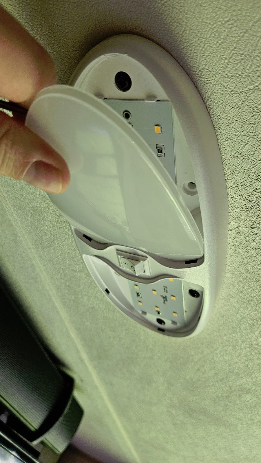 1. Pop off the diffuser cover of your interior RV light fixture, revealing the screws underneath.