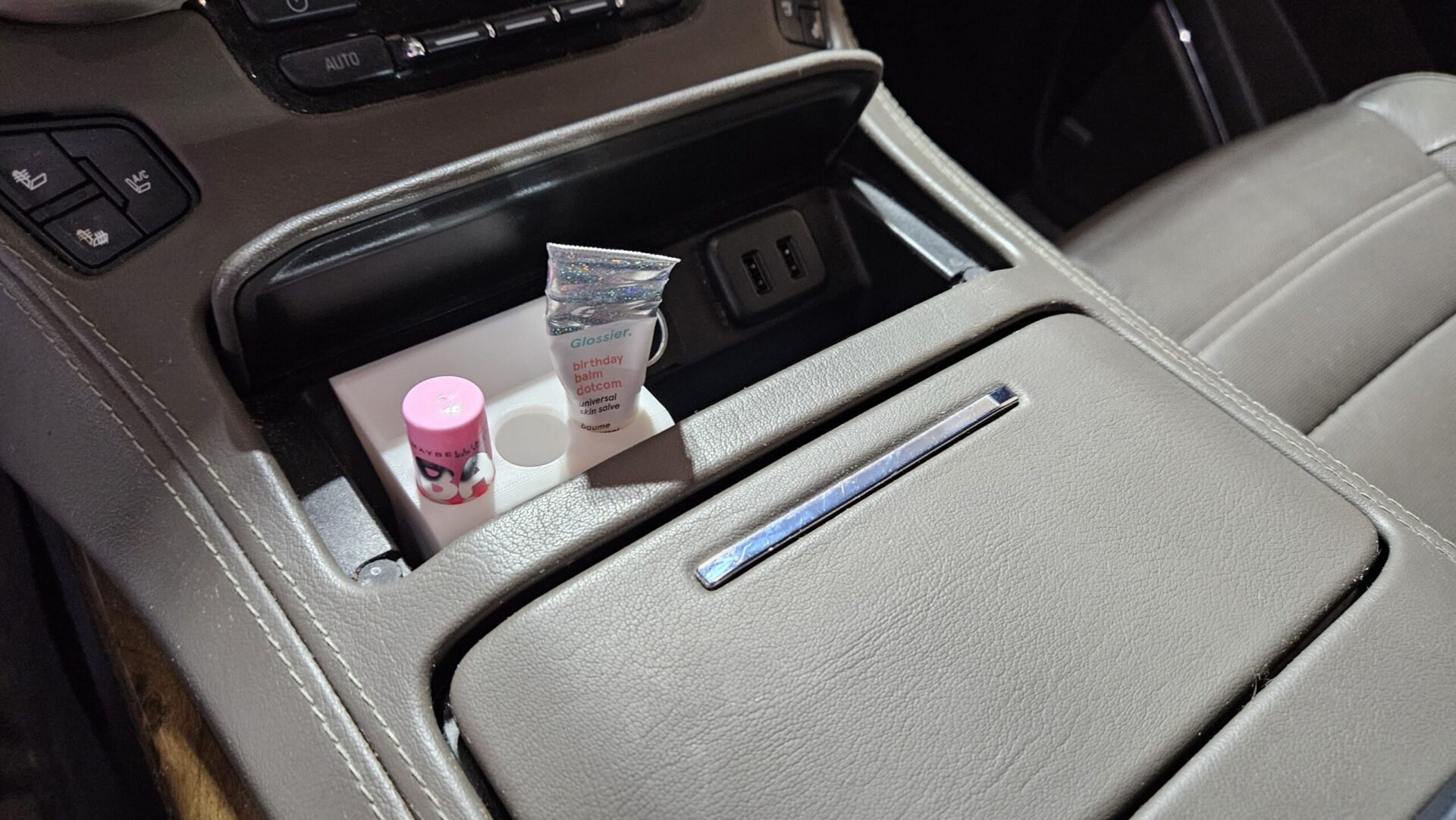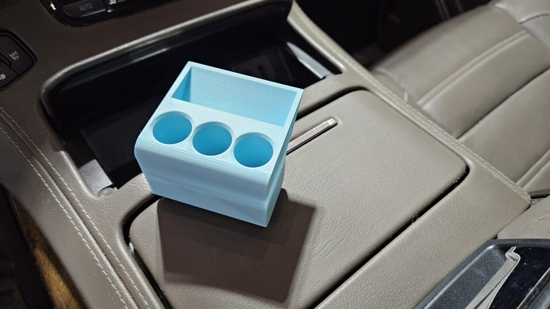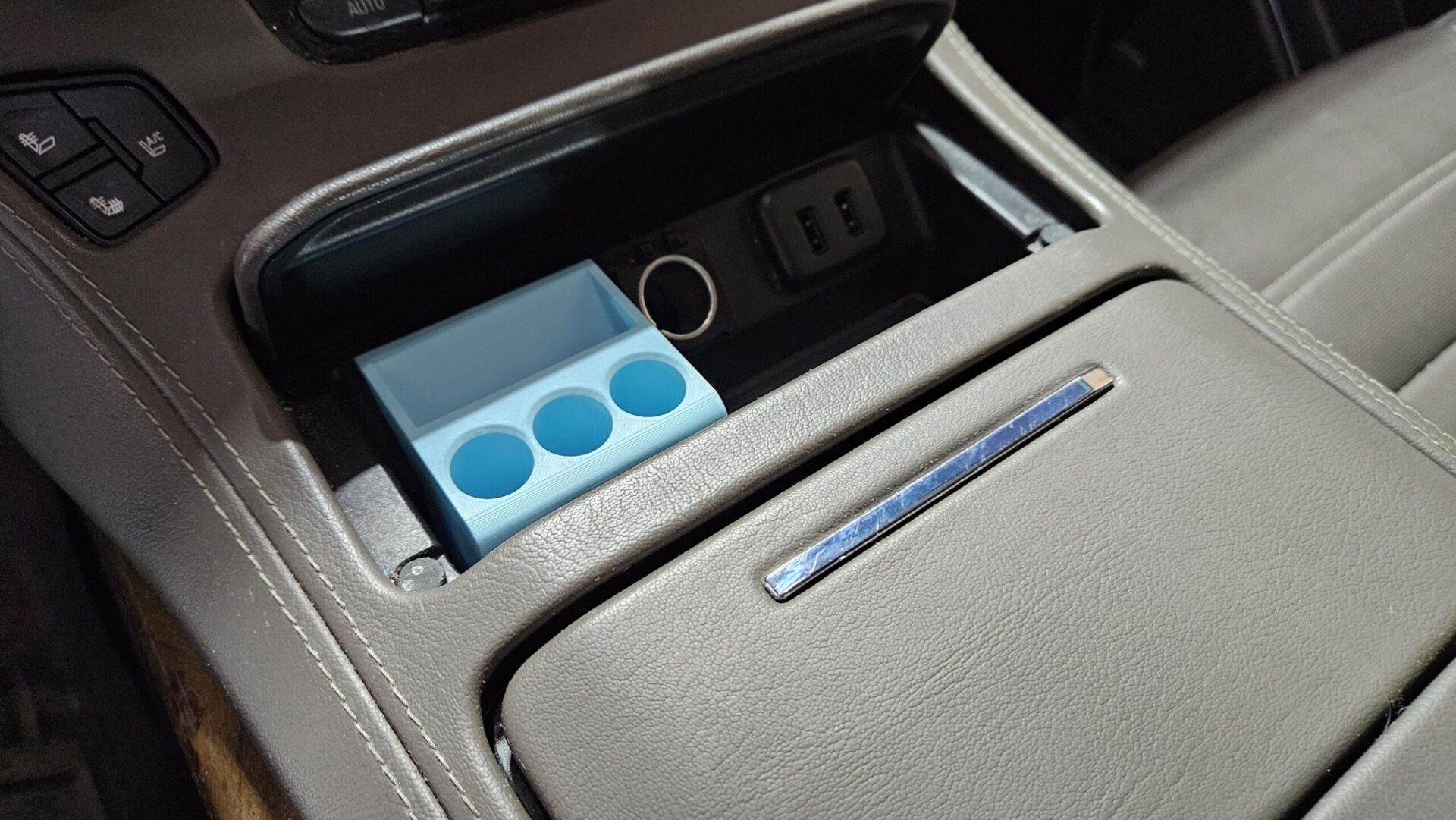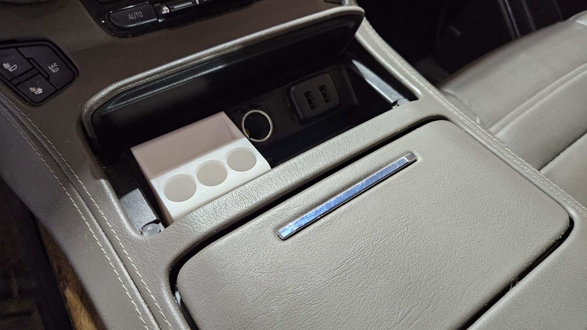 This 3D printed item has been designed to fit in the front console of 2015-2020 Yukon, Tahoe, Suburban, and Escalade vehicles.