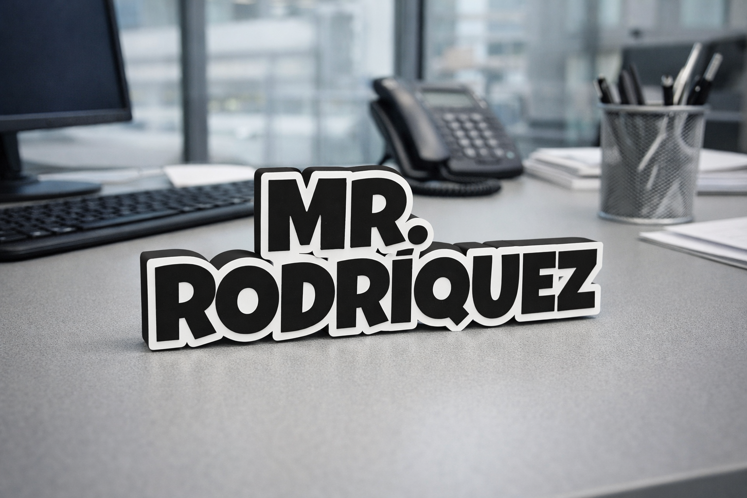 Elevate your workspace or gift something truly unique with our custom-made 3D printed name plates. Unlike flat printed signs, these feature bold, raised 3D lettering that creates a professional, tactile effect that stands out on any desk or shelf.